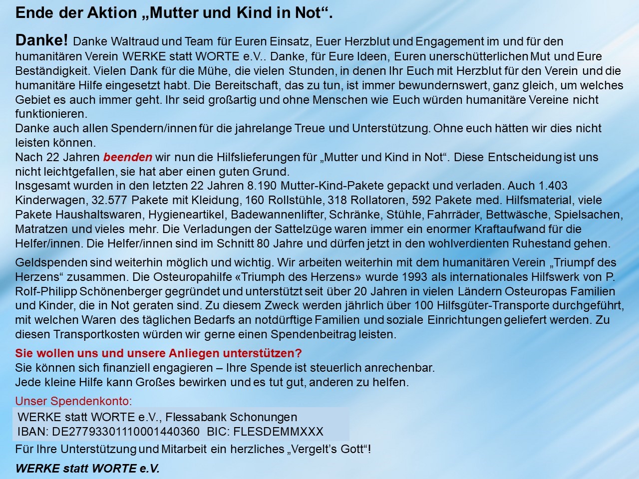 Ende der Aktion „Mutter und Kind in Not“. Danke an alle für 22 Jahre Hilfe.